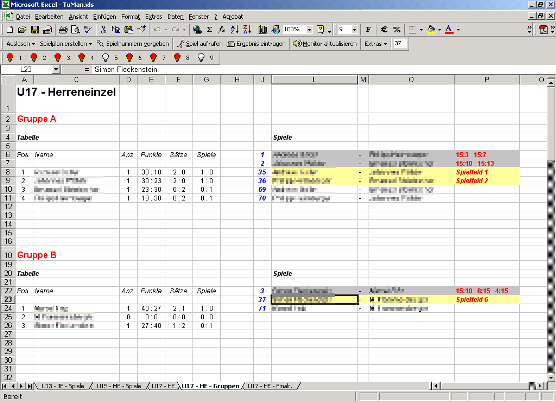 • Spielaufruf (optional mit automatischem Ausdruck eines Schiedsrichterzettels) über Kontextmenü oder Symbolleiste