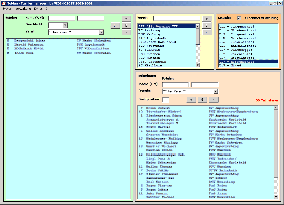 • Intuitive Zuordnung von Teilnehmern (Einzel) und Paarungen (Doppel / Mixed) aus dem Spielerbestand in die Disziplinen inkl. Plausibilitätsprüfung