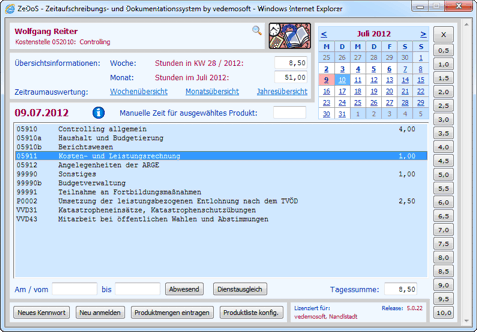 Das Aufzeichnungsmodul des Systems ZeDoS ist als Intranetanwendung konzipiert und kann von allen Mitarbeitern an Ihren Arbeitsplatzrechnern genutzt werden, deren Produktzeiten zur Kosten- und Leistungsrechnung benötigt werden. Nach dem Programmstart erhält der angemeldete Benutzer sofort eine komplette Auflistung seiner möglichen Produkte, die er jederzeit an seine individuellen Anforderungen und Vorstellungen anpassen kann (Reihenfolge, Produkte ausblenden). Auch der aktuelle Tag ist bereits voreingestellt, die Auswahl lässt sich aber über einen Kalender jederzeit ändern. Für die Produktzeiterfassung ist dann lediglich das jeweilige Produkt in der Liste zu markieren und die entsprechende Zeitdauer mit Hilfe der Zeitschaltflächen oder über die Tastatur zuzuordnen.