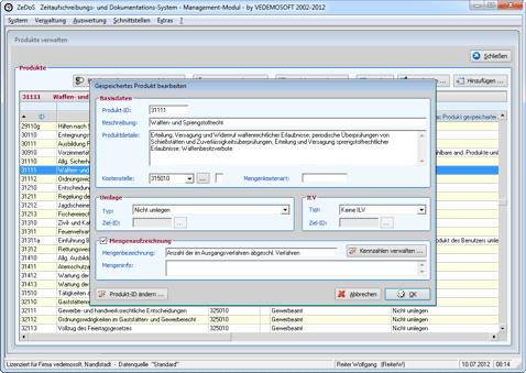 Das komfortable Management-Modul bildet das Herzstück des Systems ZeDoS. Es bietet dem Verfahrensverantwortlichen alle Funktionen, die er für die Inbetriebnahme und Pflege des Systems benötigt. Des weiteren ermöglicht es die Auswertung der im Aufzeichnungsmodul erfassten Produktzeiten und -mengen.
